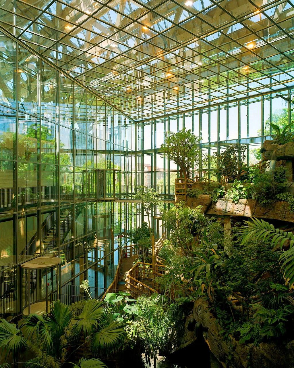 - The center's seven floors are designed as interconnected ecosystems, allowing visitors to travel from a tropical rainforest to outer space within minutes